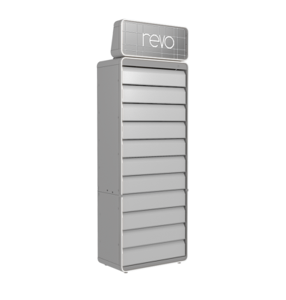 REVO to regał na wyroby tytoniowe, który dzięki innowacyjnemu systemowi zamykania za pomocą klapek jest zgodny z istniejącymi w wielu krajach Europy wymogami Retail Display Ban (RDB). Jest prosty w obsłudze – klapki można otwierać i zamykać za pomocą jednej ręki.